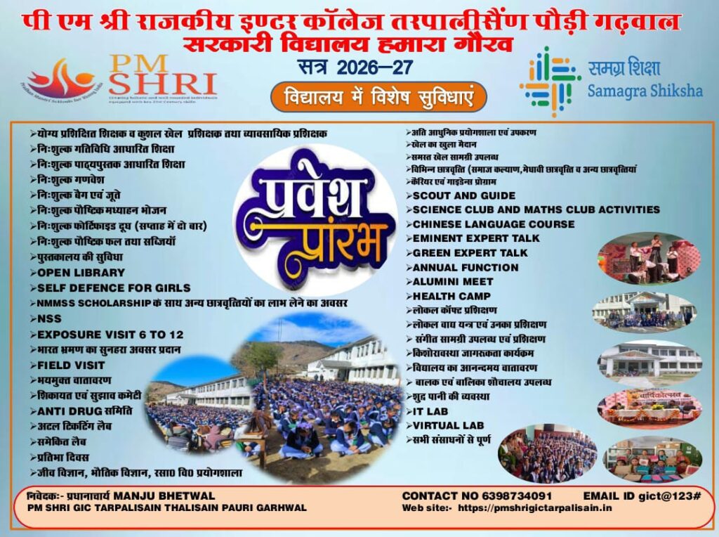 PM SHRI GIC Tarpalisain Pauri Garhwal was established in 1964 and it is managed by the Department of Education. It is located in Rural area. It is located in Thalisain block of pauri garhwal district of Uttarakhand. The school consists of Grades from 6 to 12. The school is Co-educationalist dedicated to providing excellent education and helping students grow into future leaders, while fostering a supportive and enriching learning environment. Hindi/English is the medium of instructions in this school. This school is approachable by all-weather road. In this school academic session starts in April.